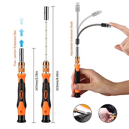Convenient and Easy: An extra extension rod with adjustable length and a flexible soft shaft are offered, allowing you to reach screws that are completely inaccessible, great for stereo work. The flexible shaft is also helpful to solve puzzle about some blind angle screws