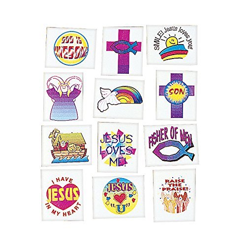 -. Feature : 72 Religious Tattoos. / They're only temporary! These 1 1/2" - 2" Religious Tattoos have religious images and messages and are perfect for Sunday School classes , Trunk or Treat handouts or Vacation Bible School groups. / You can also put them in Easter baskets or Christmas stockings! Easy to apply and remove. / Safe and non-toxic. (6 dozen per unit)