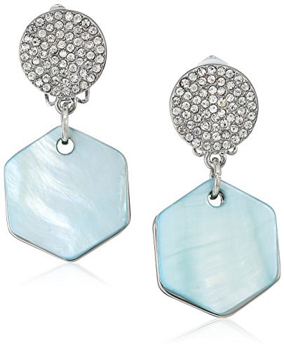 T Tahari Pave Top with Hexagon Mother-Of-Pearl Disc Drop Silver/ Blue Clip Earrings