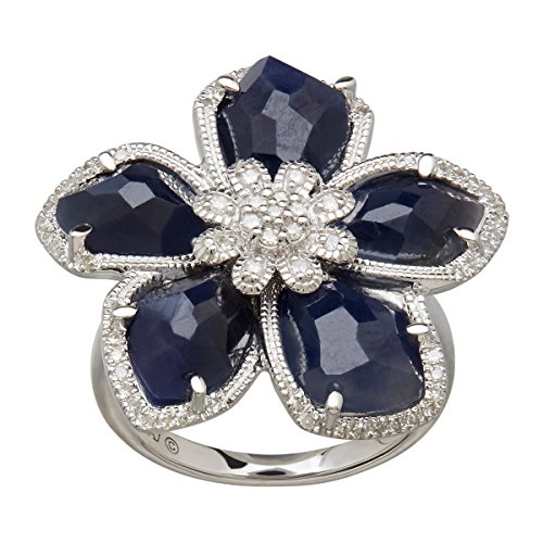 -. Title : 8 ct Natural Sapphire & 1/4 ct Diamond Flower Ring in Sterling Silver