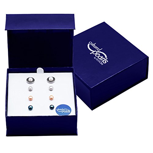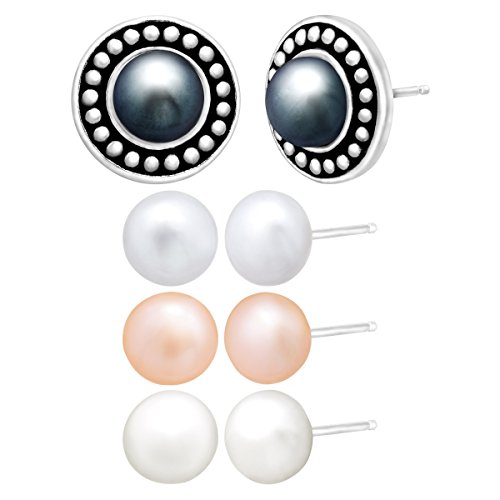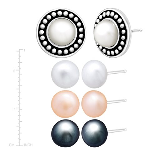 Mix and match with this multi-pearl stud earring set from Honora! This collection features four pairs of 6-7.5 mm button cultured pearl stud earrings in black, gray, rose, and white enclosed in a removable jacket in sterling silver. Pieces measure 1/2 by 1/2 inches with the jacket and 1/4 by 1/4 inches without. Pearls have been dyed to enhance their appearance.Feature