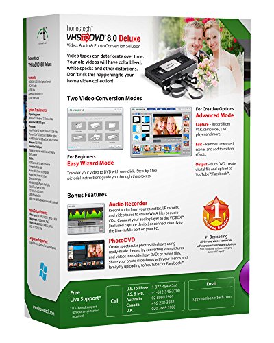 Videotapes can deteriorate over time. Your old videos will have color bleed, white specks, and other distortions. Don't risk this happening to your home video collection! VHS to DVD 8.0 Deluxe provides everything you need to easily convert your videos to digital formats. All you need is a VCR and a PC with a DVD burner and, with VHS to DVD's Easy Wizard Mode, you can transfer your video to DVD with one click. Step-by-Step pictorial instructions guide you through the process. For more creative options, VHS to DVD 8.0 Deluxe's Advanced Mode lets you capture video from analog or HDV/DV camcorder, VCR or DVD player and more. You can also edit unwanted scenes and add transition effects, burn DVDs with custom menus, convert video formats for iPhone, iPad, and Android devices. When you're ready, you can upload video to YouTube or Facebook with one click. More, you can capture still images of scenes from your video. To revive old music, use the included Audio Recorder software to convert audio from cassettes, LP records, and video tapes to create WMA files, or audio CDs. The newly added Photo DVD allows you to create spectacular photo slideshows using ready-made themes by converting your pictures and videos into slideshow DVDs or movie files.Feature