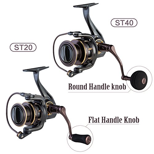 -. Feature : ALL METAL BODY DESIGN, MORE DURABLE--6061-T7 Aluminum body, body cover and rotor provides increased corrosion resistance and exceptional durability; Dual propulsion anti-twist line roller dramatically reduces the line twist problem and reducing the wearing of your line. Super smooth surface design makes you feel extremely comfortable when hold it in your hand. / HIGH QUALITY PRECISION MACHINING PARTS--9 stainless steel ball bearing plus 1 roller bearing provides increased corrosion protection super smooth operation. Sealed bearing protection to avoid the reel from being decomposed by vapor, saltwater, rain, sand etc. Thick aluminum bail wire that lays the line perfectly on the spool and improves the durability when cast the line. The schematic paper is included in the box, good for you to know better about the reel structure. / SALTWATER CORROSION RESISTANCE FULLY SEALED DRAG SYSTEM--Sealed drag system with carbon drag washer ensure the reel operates smoothly, with added drag power and durability, for years to come. Provides smooth, consistent drag pressure across the entire drag range. The unique line management system provides better control of all types of lines. With the 5.2:1 Gear Ratio, you could reel back the line very fast . Different Max drag: ST20 can hold up to 18LB and the ST40 with the 25LB test. / STRONG YET LIGHT WEIGHT--Stainless steel main shaft and main gear shaft for improved corrosion resistance; Anti-Reverse direct drive machined aluminum handle prevents the handle from spinning backward so that hook sets are powerful and accurate. Beautiful chrome-plating hallow aluminum and large size spool design makes it light enough to cast without hurting the line. With the Dual Protection Anti-Twist Line Rotor and perfect cutting design of the spool, no worries to wasting your cost lines. / PISCIFUN TAKES CARE OF EVERY SPECIFIC DETAIL OF THE PRODUCTS--Ergonomic EVA handle knob, big round knob for the ST40 to improve the cranking power and small flat knob for the ST20 to fit the reel size perfectly. High impact aluminum reel seat, no chance to break it even you are fighting the huge monster. Precision Machine cut Stainless Steel handle is interchange to for right and left hand orientation. Meanwhile, the Carbon decorating ring on body makes the reel look gorgeous.
