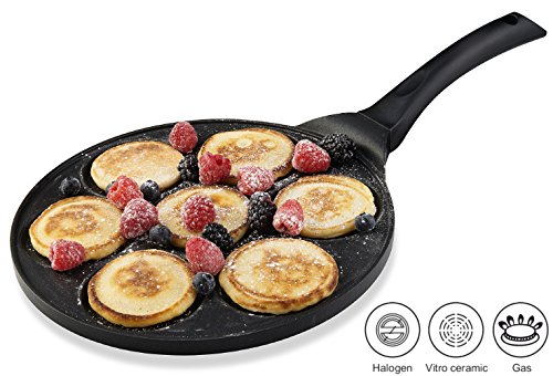 -. Feature : MULTIPURPOSE KITCHEN PAN - Unique Stovetop Griddle Features 7 Separate Vessels for Making Perfectly Uniform Silver Dollar Pancakes & More / PREMIUM DIE CAST ALUMINUM - Quality Material Ensures Maximum Heat Transfer for Fast, Even Cooking; Compatible with Wood, Nylon & Other Coated Utensils / BLACK NONSTICK SURFACE - Double Layer Premium Pfluon Coating Helps You Flip Pancakes & Other Food With Minimal Sticking; Requires Little Butter or Oil / BROAD COOKTOP VERSATILITY - Heavy Duty Pan Works on Gas, Halogen, Ceramic & Induction Cooktops; Use for Pancakes, Crepes, Blinis & Blintzes / BLISSFULLY EASY MAINTENANCE - 2mm Thick Pan & Ergonomic Bakelite Handle Offer Stress-Free Cleaning; Let Return to Room Temperature & Wash by Hand