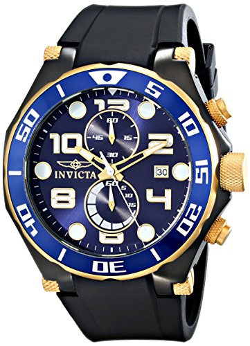 -. Binding : Watch -. Brand : Invicta -. Color : blue -. Department : mens -. EAN : 0886678220229 -. Feature : Chronograph functions with 60 second and 60 minute; date window at 3:00 / Blue dial with gold tone and white hands, hour markers and Arabic numerals; luminous; unidirectional 18k gold ion-plated stainless steel bezel with blue top ring; 18k gold ion-plated stainless steel crown and pushers; flame fusion crystal; black ion-plated stainless steel case; black polyurethane strap / Japanese-quartz movement / Case diameter: 50mm / Water resistant to 165 feet -. Label : Invicta -. Manufacturer : Invicta -. Model : 17814 -. MPN : 17814 -. PackageQuantity : 1 -. PartNumber : 17814 -. ProductGroup : Watch -. ProductTypeName : WATCH -. Publisher : Invicta -. Studio : Invicta -. Title : Invicta Men's 17814 Pro Diver Analog Display Japanese Quartz Black Watch -. UPC : 886678220229