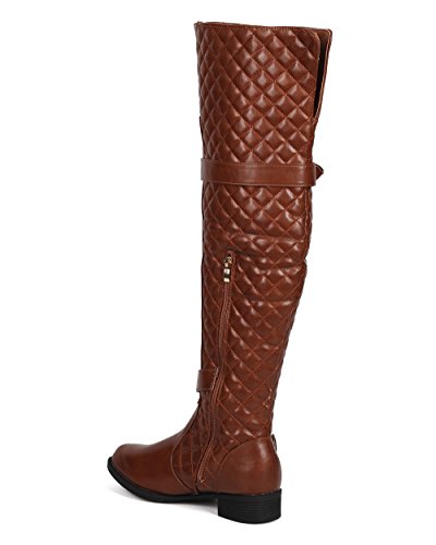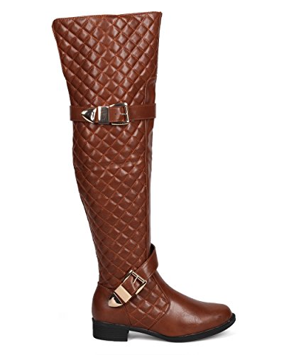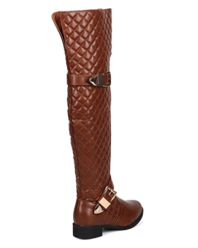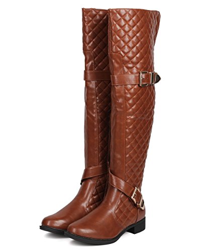 (Liliana)/Women's/Boots/DIRECT FROM USA/Liliana DA35 Women Quilted Leatherette Knee High Buckle Riding Boot - Cognac
