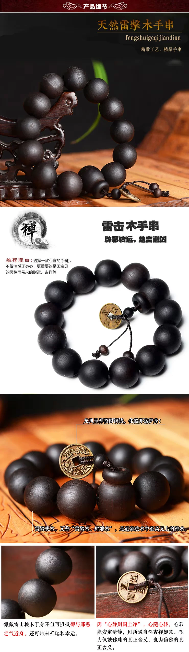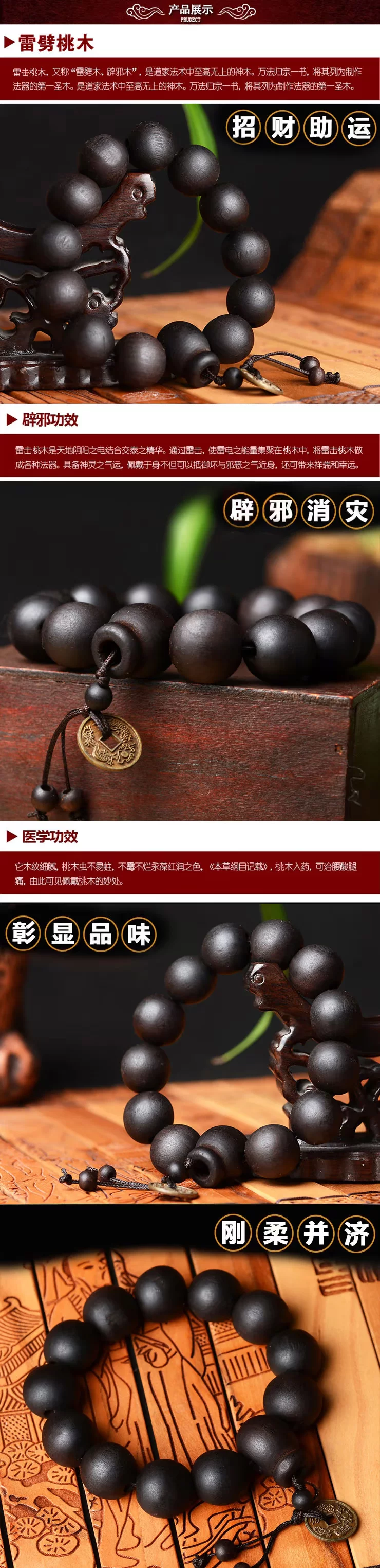 招财雷击黑桃木铜钱佛珠手链手串