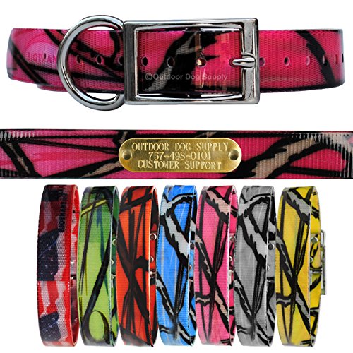 Studio : Outdoor Dog Supply Publisher : Outdoor Dog Supply Binding : Misc. Product Description These collars are extremely durable and have a tight hole spacing in order to get the best fit on your dog. It has a heavy duty D ring near the buckle. Fits dogs with a neck size of 14" to 21" . The overall length of the collar is 23". Comes with a free custom brass name plate, you get three lines of text: Line 1- 18 characters, including spaces. Line 2- 16 characters, including spaces. Line 3- 18 characters, including spaces. Please email us your tag information within 48 hours of placing your order or call to give us the tag information. If no tag information is received we will ship your collar with no tag included. Please note we cannot stamp email addresses on tags. If the information you provide exceeds the spacing limitations stated, we will revise your information to include as much information as possible from what you provided. Due to the high volume of customized name tag collars we sell and shipping time requirements, we are not able to contact buyers for tag revisions that exceed the spacing limitations. Thank you! 0