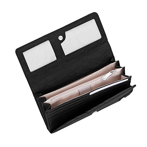 -. Feature : Inside: four cash compartments, 12 credit card slots, interior zip, two id slots / Snap button closure