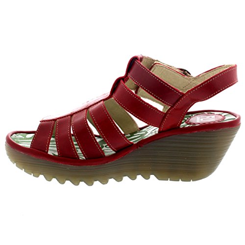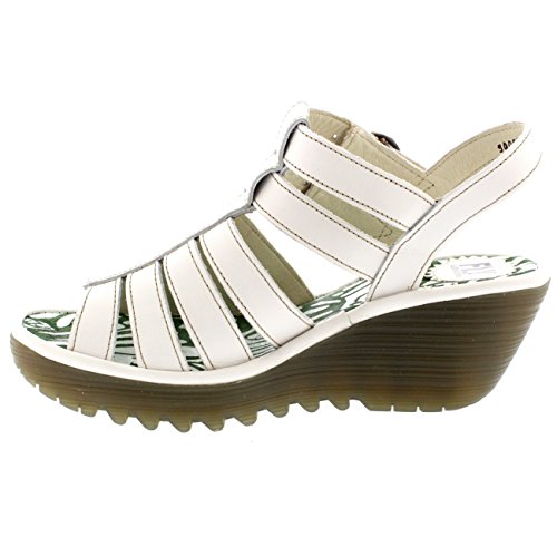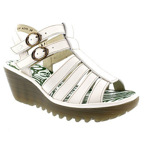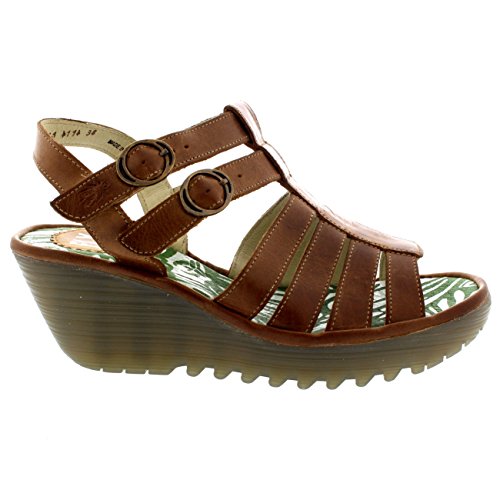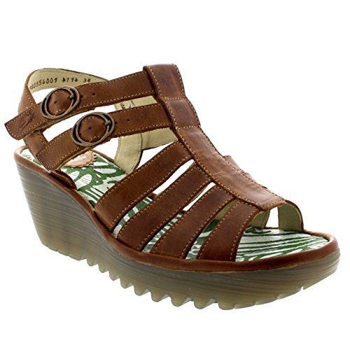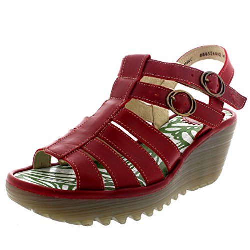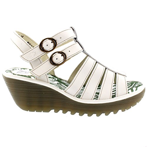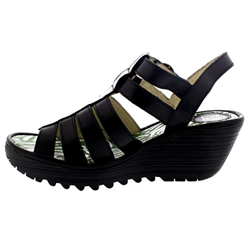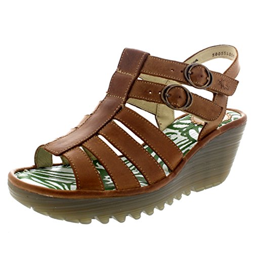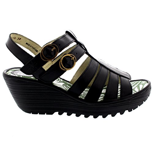 Product Description Fly London Ygor features a full leather upper, leather lining, rubber sole unit, low wedge heel, twin adjustable buckles, open toe front, cut out inserts, contrasting stitching, cleated sole unit and the Fly London Fly Logo embroidered on the strap. 0