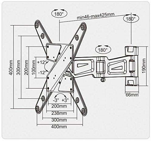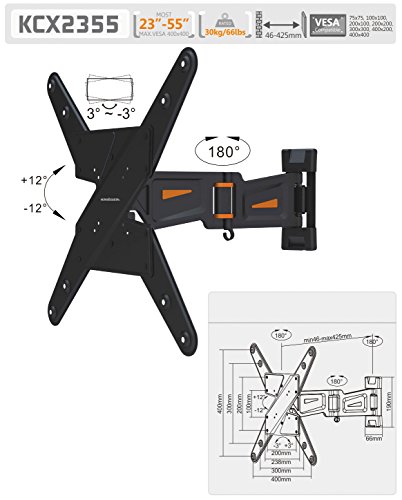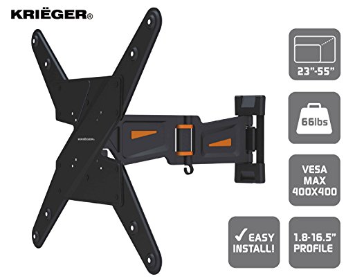 -. Binding : Electronics -. Brand : KRIEGER -. EAN : 0841915002358 -. Feature : Heavy guage steel supports screens up to 66 lbs. compatible with VESA (mounting hole pattern) 75mmx75mm / 400x400mm / 400x200mm / 300x300mm / 200x200mm / 200x100mm / 100x100mm (16"x16"/16"x12"/16"x8"/12"x12"/12"x8"/8"x8"/8"x4"/4"x4") / Post-installation level adjustment allows the TV to perfectly level / Tilt, swivel and rotate for maximum viewing flexibility; VESA plate can be taken off for easy installation by one person / Tilt: -12° ~+12° / Swivel: -180°~+180° / Level Adjustment: -3° ~+3° / Low Profile mount retracts to 1.8" to save space, Extends 16.5" from the wall -. Label : KRIEGER -. Manufacturer : KRIEGER -. Model : KCX2355 -. MPN : KCX2355 -. PackageQuantity : 1 -. PartNumber : KCX2355 -. ProductGroup : Speakers -. ProductTypeName : AV_FURNITURE -. Publisher : KRIEGER -. Studio : KRIEGER -. Title : KRIËGER® KCX2355 Full Motion Swivel Articulating 16.5 inches Extension Arm TV Wall Mount LED LCD Plasma 23-55" TVs fits up to VESA 400x400, 66lbs, with a Flush 1.8" Profile - Lifetime warranty -. UPC : 841915002358