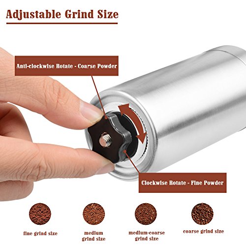 【ADJUSTABLE GRIND SIZE】Customize the grind size, clockwise from coarse to fine grind. Coarse for coffee grinder French Press Grind Chemex. Medium--for Drip Pour over coffee. Fine-- for Aeropress, Espresso Grinder. The capacity of the stainless steel coffee grinder is about 35 Grams, equivalent to 2 cups of Coffee.