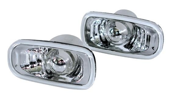 | クリアレンズのサイドマーカー(フェンダーマーカー)ランプでAssyで交換します。ノーレンズカットタイプ(ユーロタイプ)はアウターレンズはレンズカットがなく、電球を被うようにインナーレンズがあります。インナーレンズはハーフメッキコーティングしていますので通常はクロームに見え、ウインカーが点滅した時はオレンジの光が見えます。 |