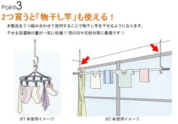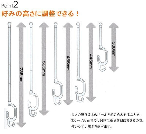 | ワンタッチ脱着で簡単に室内に物干しスペースを作ることができるので、急な雨でも安心♪長さの違う3本のポールを組み合わせることで、300~735mmまで5段階に長さを調整でき、使いやすい高さを選べます。また、本製品を2つ組み合わせて使用することで物干し竿を干せるようになります。 |