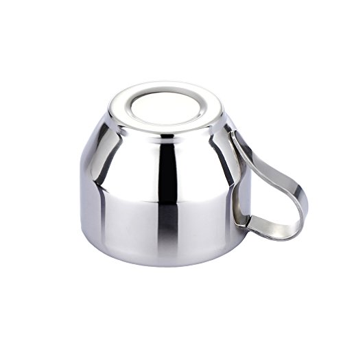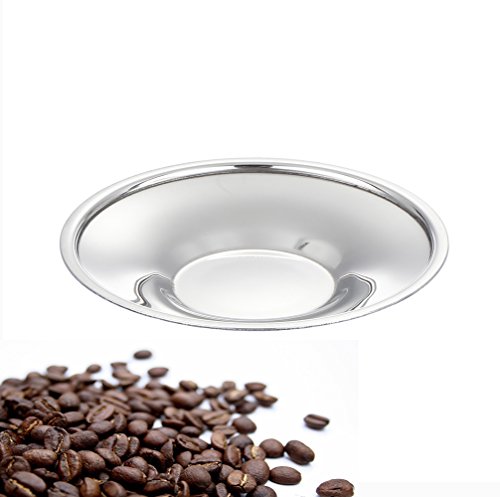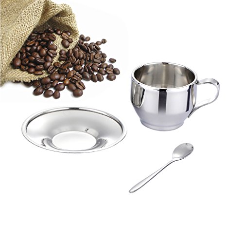 WeHome's coffee cup set is made from high quality stainless steel. The coffee cup is double insulated to keep your beverage hot for longer and to prevent you from burning your fingers when you hold the cup. The internal diameter of the cup is 2.8" and the height is 2.2". The diameter of the saucer is 4.7" and length of the spoon is 4.9". This coffee cup can hold 125ml of your favorite beverage, be it coffee, tea or any other. The round saucer has a depression for the cup to sit in snugly. You can use the set at your home, cafes, bars, hotels, or restaurants. It is also a good gifting item at housewarming get-togethers, weddings, birthday parties, or other social gatherings.