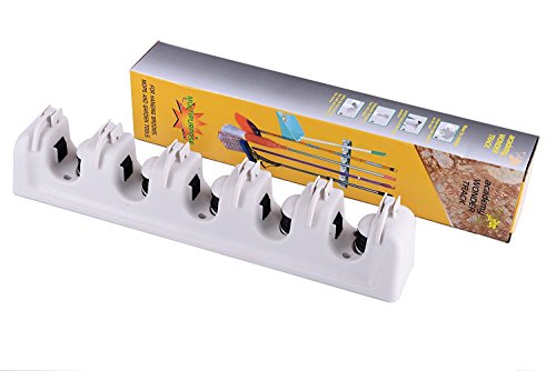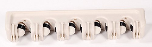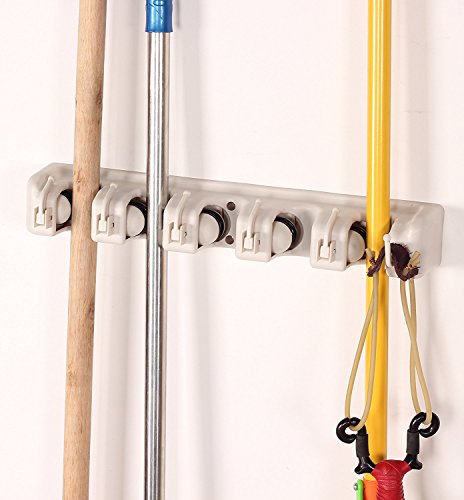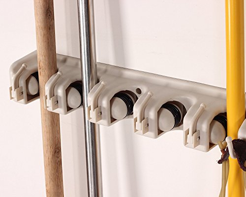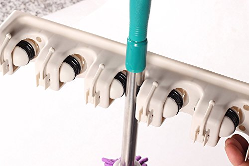WOOSAL Home Kitchen Plastic Mops and Brooms Rack with 5 Position Slots and 6 Hooks