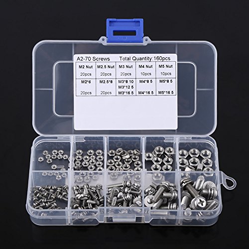 160pcs M2 M2.5 M3 M4 M5 304 Stainless Steel Pan Head Screws Nuts Assortment Kit with Storage Box
