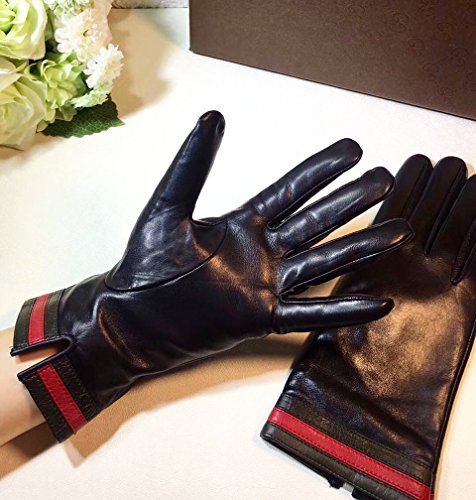 Product Description Highest Quality leather gloves for women. Fits hand well for medium size. Only one-size available. Banded with deep red and strips on wrist. Product as shown in picture. 0