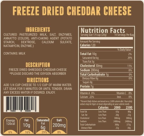 NUTRITIOUS CHEESE – Real cheese! Whole, pure and ready to refresh. Our freeze drying process allows the cheese to retain all of its nutrition so it really is fresh and flavorful. Truly, this is the same as eating fresh cheese right out of your refrigerator.