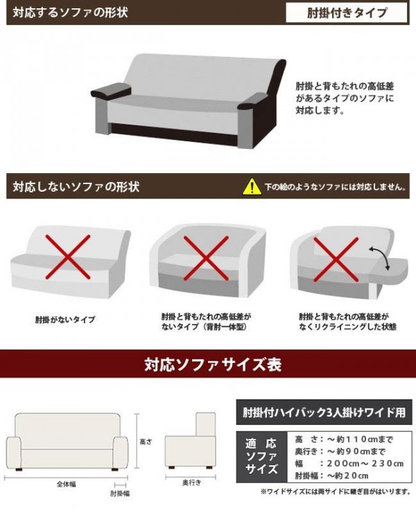 | 仕様 | 抗菌防臭加工(SEKマーク取得) ウォッシャブル(洗濯機洗い可能・ネット使用) 【適応ソファーサイズ】 高さ:~約110cmまで 奥行き:~約90cmまで 幅:200~230cm 肘掛幅:~約20cm ※ワイドサイズには両サイドに継ぎ目が入ります。 |
