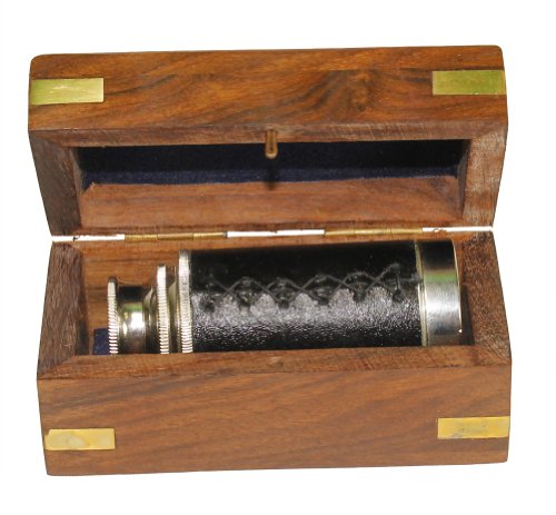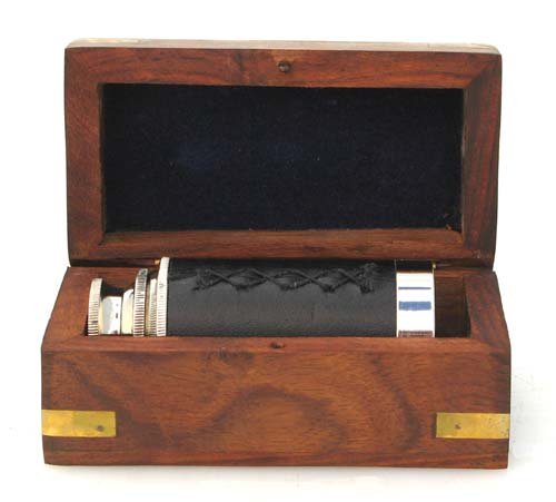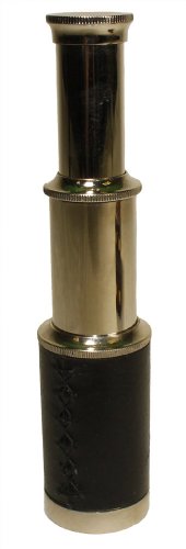 This high quality 6" silver telescope is crafted from brass with a beautiful silver finish and comes with a leather handle. The telescope will magnify objects and landscapes with a clear image. The scope extends to a full 6" and then can retract to fit into its own ornate box. Galileo is credited with inventing the first refracting telescope. Through his understanding of how light passes through a lens, he was able to construct a device that focused on an image and enabled the user to see an object as though it were brighter, clearer or closer. The magnification of this silver telescope is 3x. |