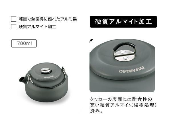 硬質アルマイト加工です。 製造国:中国 素材・材質:アルミニウム(アルマイト加工)(底の厚さ0.8mm)つまみ・取っ手:ステンレス鋼、シリコーン 商品サイズ:(約)130×150×高さ77mm(本体のみ) 重量:約137g 仕様:適正容量:約550ml満水容量:約700mlIH不可 ※サプライヤー直送品 ご注文後3~4営業日後の出荷となります【商品名】CAPTAIN STAG キャプテンスタッグ アルミキャンピングケットル 700mL UH-4101