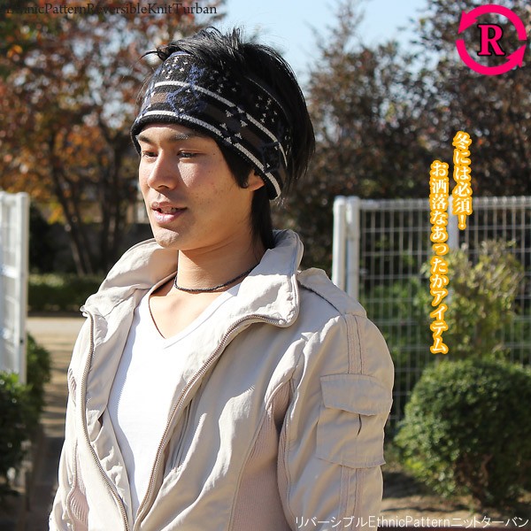 ニット素材であたたかさ、手触り良し抜群のターバン!程よく伸縮するので、フィット感も自然!!男もキュートにカッコよく!表の柄はエスニック柄風なデザインで若さと可愛さを演出☆裏返すと落ち着いたシンプルなカラーで、大人の男をカッコよく演出★その日の気分に応じて自分らしさをチョイスできるので、オシャレの幅がひろがります。ターバンとして使うだけでなく、首元のマフラー代わりとしても使えるので、お洒落なだけじゃない機能性も兼ね備えています。