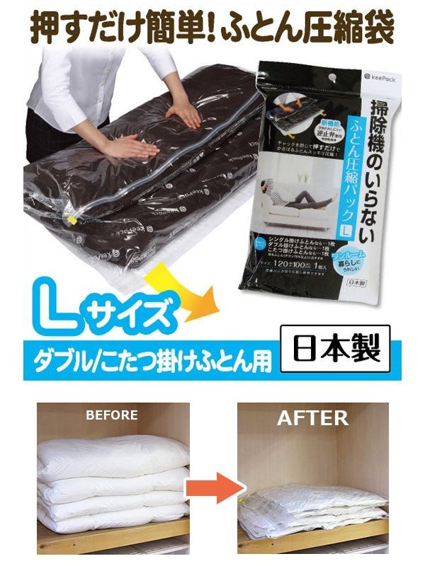 | 仕様 | 【収納のめやす】 シングル掛けふとんなら1枚 ダブル掛けふとんなら1枚 こたつ掛けふとんなら1枚 ※ふとんの大きさ・厚み等により異なる場合があります。 【圧縮のめやす】 羽毛掛けふとんの場合、圧縮前の厚みの約2分の1 ※ふとんの種類・使用状況等により異なります。 |