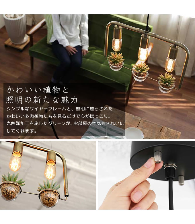 | ポイント | シンプルなワイヤーフレームと、照明に照らされたかわいい多肉植物たちを見るだけで心がほっこり。 また、光触媒加工を施したグリーンがお部屋の空気もきれいに。 インテリア性と機能性を兼ね備えた照明の新しい価値を提案します。 |
