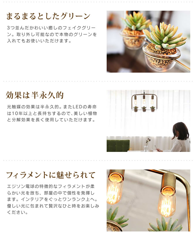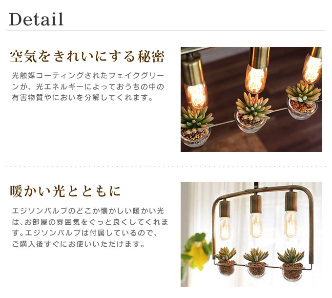 | 付属品 | ガラスカップ×3、フェイクグリーン×3、エジソンバルブ×3、説明書(保証書付) |
