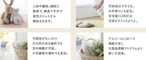 | 100%天然成分で、化学剤(次亜塩素酸・アルコール等)を使用しておらず、環境にもやさしい商品です。シュッとするだけで臭いの元を分解し、安心安全はもちろん抗菌性を保持します。自衛隊への納入実績もあり、お部屋の空間や台所、衣類等様々な場所や用途で活躍します!! |