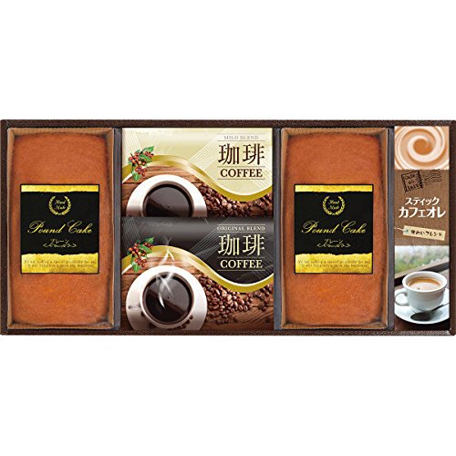 原材料:ドリップコーヒーマイルドブレンド(7g×2袋)・ドリップコーヒーオリジナルブレンド(7g×2袋)・カフェオレ(12g×4袋)×各1、パウンドケーキ(プレーン)×2