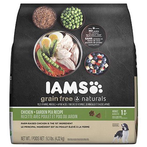 -. Binding : Misc. -. Brand : Iams -. EAN : 0019014706440 -. Feature : Discontinued by Manufacturer / Farm-raised chicken is the #1 ingredient in our wholesome dog food / IAMS Grain Free Naturals Adult Dry Dog Food is made using no artificial preservatives, colors or flavors / Our hearty dog food features a rich blend of vitamins and antioxidants to support a healthy immune system / IAMS Dog Food is made without grains, corn, soy, or by-product meal -. Label : Iams -. Manufacturer : Iams -. Model : 10136830 -. MPN : 10136830 -. NumberOfItems : 1 -. PackageQuantity : 1 -. PartNumber : 10136830 -. ProductGroup : Pet Products -. ProductTypeName : PET_SUPPLIES -. Publisher : Iams -. Size : 9.3 lbs. -. Studio : Iams -. Title : IAMS Grain Free Naturals Adult Chicken and Garden Pea Recipe Dry Dog Food 9.3 Pounds -. UPC : 019014706440