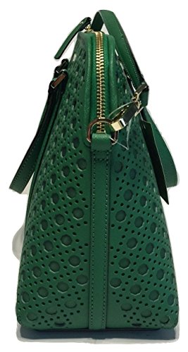 Perforated Saffiano Leather Bag with top zip closure, gold toned hardware and leather trim, Fabric lined Interior features zip, cellphone and multi-function pockets