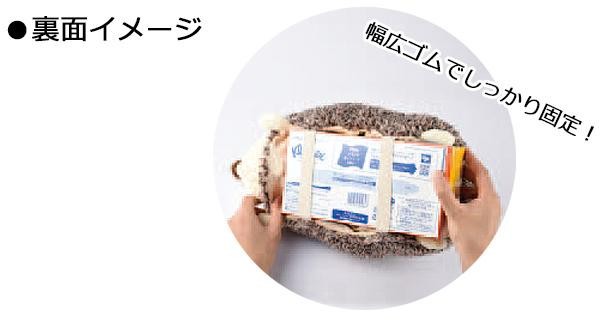 | かわいいハリネズミがティッシュカバーになりました。BOXティッシュは底面から簡単にセットでき、2箇所の幅広ゴムでしっかり固定できます。底面にフック紐が付いているので、吊り下げることも可能です。 |