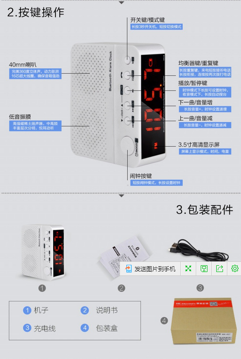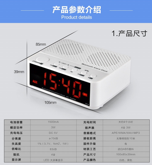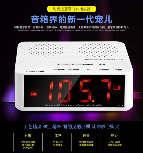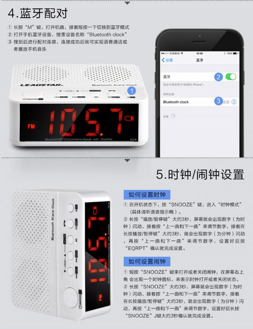 Clock mode, Bluetooth mode, external audio mode, radio mode, music mode