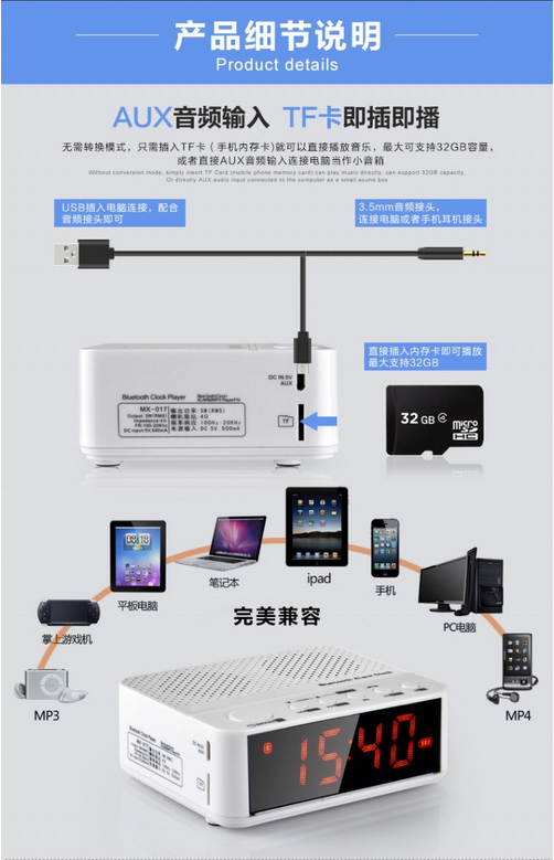 Aux audio input, TF card, plug and play
