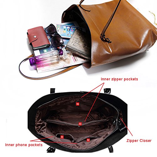 This leather bag comes with 2 generous main pockets, 1 inner zipper pocket and 1 invisible pocket. Have phone slot and card slot.Easily hold a 11" laptop, IPAD, A4 paper, umbrella and other daily things.