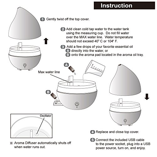 Please DO NOT exceed MAX water line when filling the water tank. Waterless safety auto shut-off function. Powered by energy saving USB port, easily hooks up to computer, phone charger, or external power bank for power.