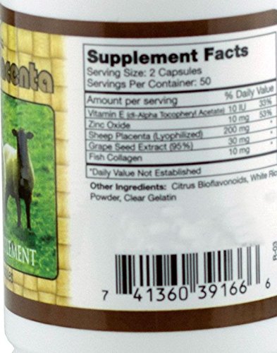 Sheep placenta is a rich source of nutrients, growth factors and bio-active cytokines. It is based on these bio-essentials that new life is developed. Scientific studies found that placenta contains high level of special proteins (placenta proteins), some of them promote cell growth, some of them regulate hormone secretion and some of them strengthen our immune system. Placenta has been used in China for over 1400 years as a Chinese Medicine or promoting general health. It has a wide range of health benefits including enhancing body energy, skin complexion and stopping aging process. Recent scientific research has shown placenta contains rich growth factors, hormones and antibodies, and other concentrated nutrients that can rejuvenate organic tissue. Recommended Use: As a dietary supplement,take 2 capsules daily before bedtime. Made In U.S.A *This statement has not been evaluated by the Food and Drug Administration. This product is not intended to diagnose, treat, cure or prevent any disease. Keep out of the reach of children. Store in a cool dry place, tightly closed.Feature