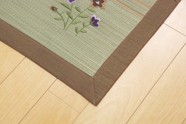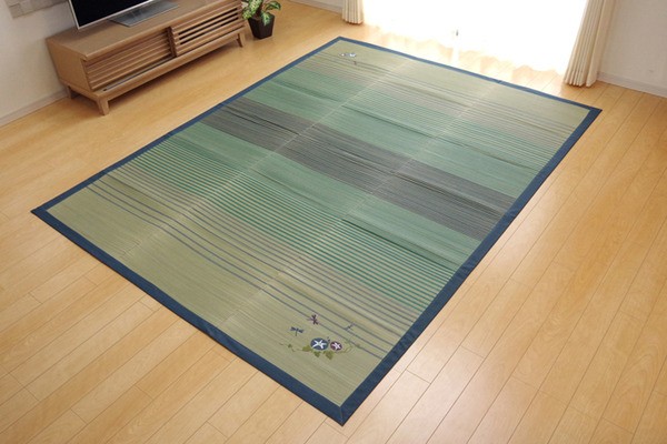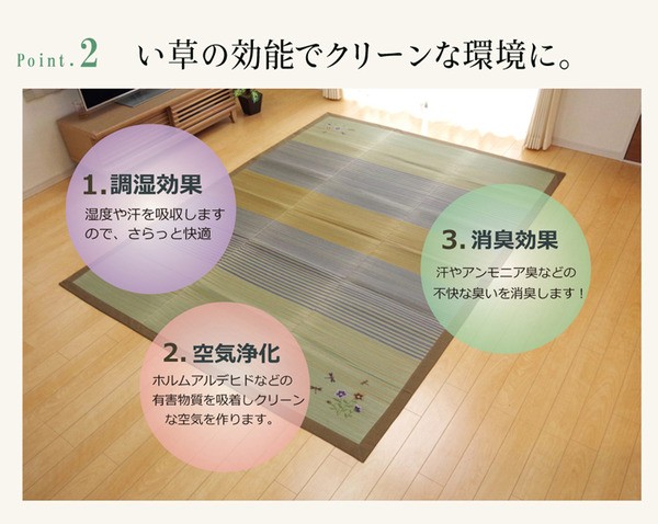 和をイメージしたデザインのい草ラグです。裏面には滑りにくい加工をした不織布を使用しているため、フローリングにも最適です。い草には空気の自然浄化作用、湿度の調節作用などがあります。い草に青森ヒバ加工を施しています。(抗菌、防臭効果)