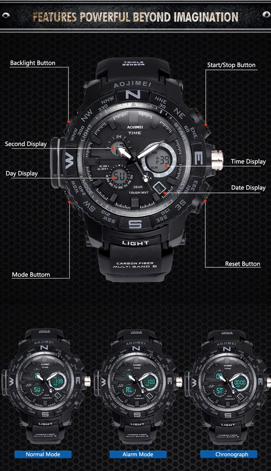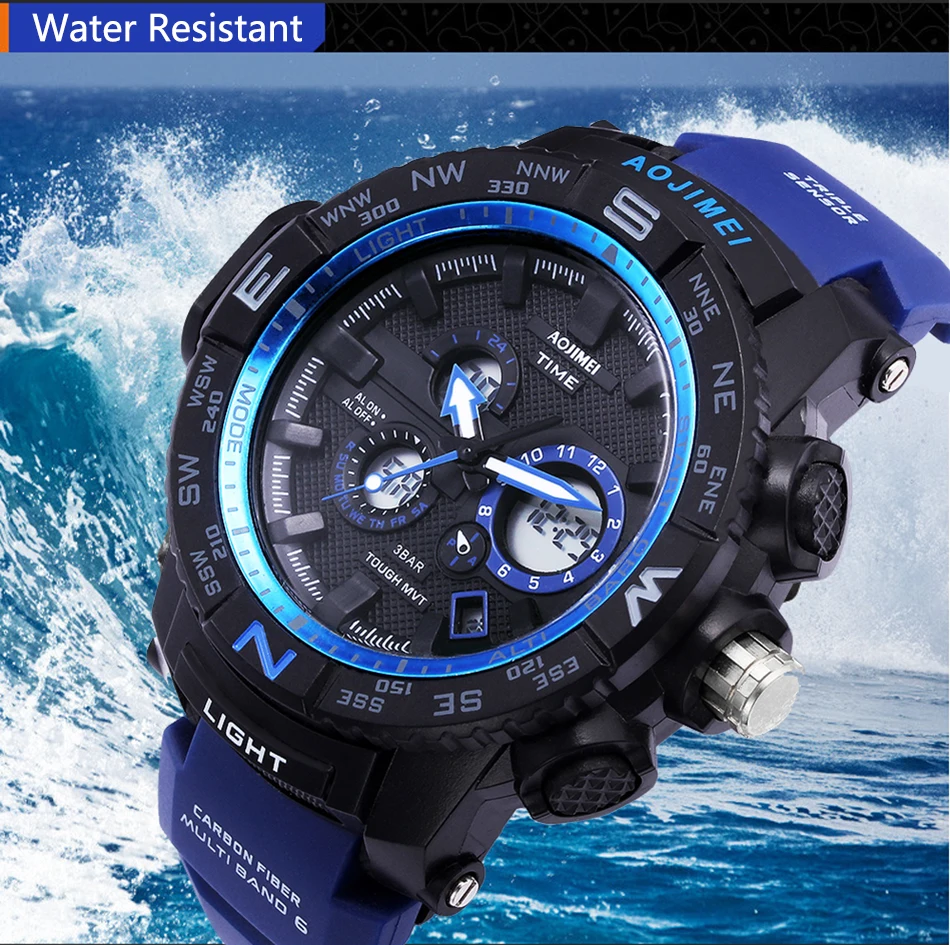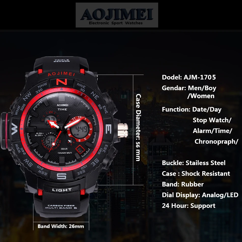 Feature:Water Resistant,LED display,Luminous,Multiple Time Zone,Stop Watch,Back Light,Complete Calendar,Shock Resistant,Chronograph,Luminous Hands,Auto Date,Anti-magnetic,Alarm