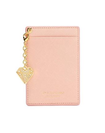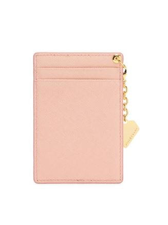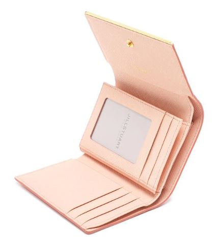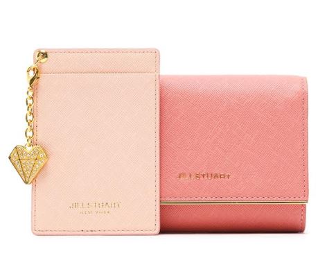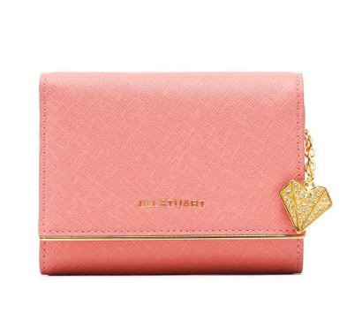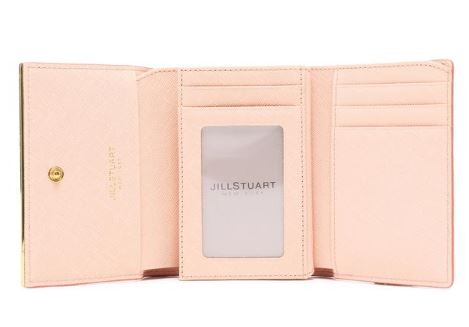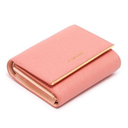내부 베이비 핑크 배색으로 여성스럽고, 심플한 외관을 보여주며, 하단의 로고와 골드 바 장식으로 포인트를 준 3단 반지갑입니다.