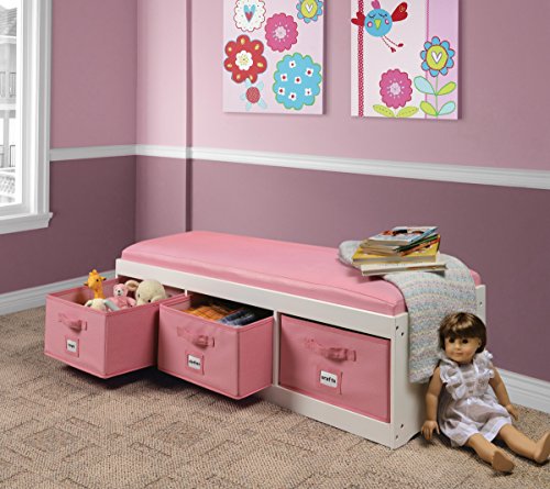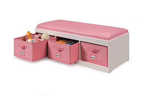 A comfortable bench with ample storage below to organize toys, stuffed animals, clothes, videos, games, linens, towels, and more. Classy, durable, wipe clean, faux leather covering on cushion and bins. Sized for children to enjoy as a reading spot, or a place to perch while dressing and putting on shoes. Convenient for kids’ rooms at the end of a bed or under a window; or hallways, foyers, guest rooms, and more. Wood frame measures 45. 25" W x 15. 75" D x 11. 75" H. With the cushion, the unit is 13. 75" H. Cubby areas are each 14. 25" W x 15" D x 7. 75" H. Bins/baskets measure 4" W x 15" D x 7. 5" H. Card holders on front of bins allow you to label them and know what is inside at a glance. Handles on the front of the bins make it a breeze for even the smallest hands to pull open to search the treasures inside. Bins are reinforced with binding on all edges. The bins are fully removable for use anywhere in the house, and they fold flat for storage if not being used. Solid back panel prevents the baskets or other contents from being pushed out the back Top cushion is secured to the top panel which can be lifted/removed like a lid allowing full view of everything inside. Bench supports up to 200 pounds. Bench made of made of engineered wood. Wipe clean with a damp cloth and mild detergent and dry thoroughly. Wipe clean fabric is Polyurethane Leather; inside the bins is 65% Polyester/35% Cotton fabric lining. Cushioning is one inch thick polyurethane foam. Wipe/spot clean the bins as needed. Never immerse in water. Adult assembly required. Illustrated instructions included. This item ships in its original carton which may include a photo of the product. All measurements approximate. Product may vary slightly from shown. Props and accessories shown with the unit are for illustration purposes only and not included.Feature
