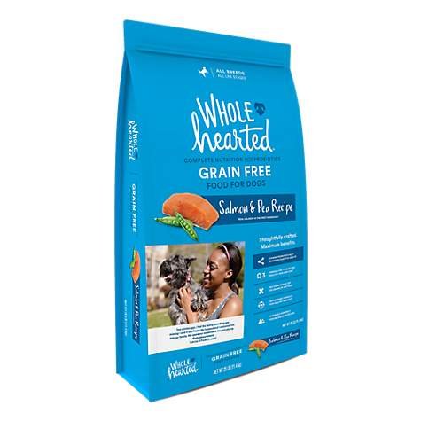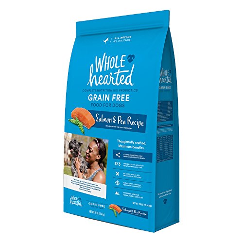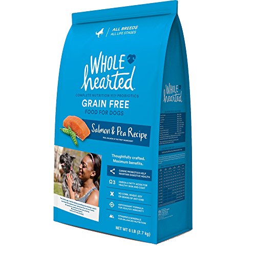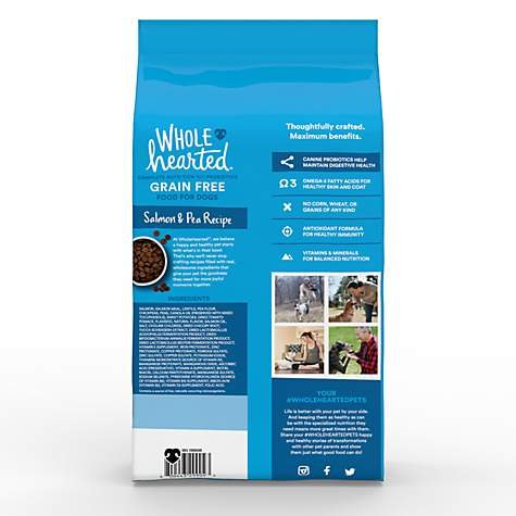 -. Binding : Misc. -. Brand : WholeHearted -. Feature : Grain Free, All Life Stage Recipe Dry Dog Food from WholeHearted / Real salmon is the first ingredient / Canine probiotics help maintain digestive health / Omega-3 fatty acids for healthy skin and coat / No corn, wheat, or grains of any kind -. Label : WholeHearted -. Manufacturer : WholeHearted -. PackageQuantity : 1 -. ProductGroup : Pet Products -. ProductTypeName : PET_SUPPLIES -. Publisher : WholeHearted -. Studio : WholeHearted -. Title : WholeHearted Grain Free All Life Stages Salmon and Pea Recipe Dry Dog Food