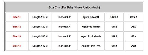 ?: Features: ?: It is made of high quality materials,Soft hand feeling, no any harm to your baby's skin ?: Solid pattern designing is fashion, make your baby more charming and lovely ?: Anti-slip design keeps baby in safe and keep your baby feets soft and warm ?: Elastic band design makes it easy to take off ?: Product information: ?: Great gift to baby ?: Gender:GirlBoys ?: Shoe upper material:PU ?: Sole material:PU ?: Closure Type:Elastic band ?: Style:Casual,Fashion ?: Package content:1 pair baby shoes ?: Size:11 ,Length:11CM ,Inches:4.3" ,Age:0~6 Month ,UK:1.5 ,US:2.5 ?: Size:12 ,Length:12CM ,Inches:4.7" ,Age:6~12 Month ,UK:2 ,US:3 ?: Size:13 ,Length:13CM ,Inches:5.1" ,Age:12~18 Month ,UK:3 ,US:4 ?: Size:14 ,Length:14CM ,Inches:5.5" ,Age:18~24Month ,UK:4 ,US:5 , 0
