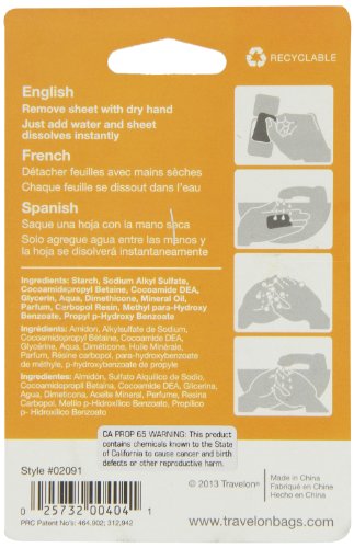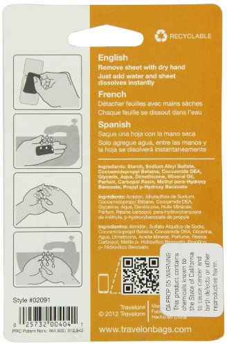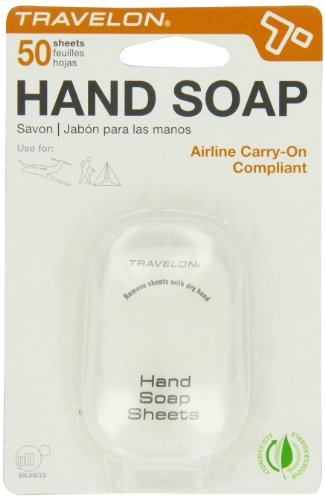 Studio : Travelon Publisher : Travelon Binding : Health and Beauty Product Description Easier to carry than a bar of soap. These paper-thin soap sheets dissolve almost instantly in water, giving you a handful of cleansing suds anywhere. TSA compliant and biodegradable, the palm-size container holds 50 sheets. Features: Dissolves in water 50 biodegradable sheets per container 3-1-1 carry-on compliant 0