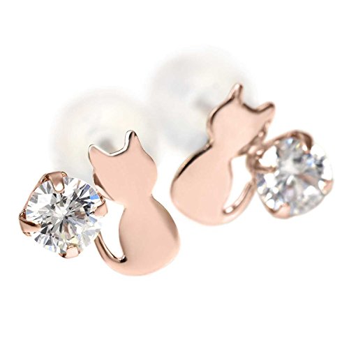 -. Title : K10 ピンクゴールド 猫 シルエット 両耳用 キャット ネコ ピアス スタッド ピアス 雑貨 4月 誕生石 キュービック ジルコニア