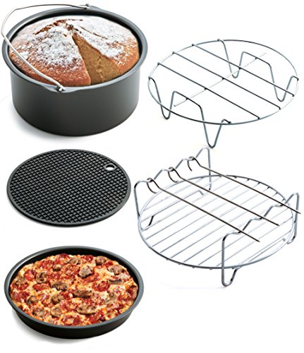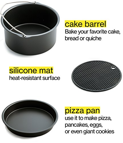 EXPAND YOUR COOKING REPERTOIRE: If you love your Air Fryer now, imagine what culinary masterpieces you can make with this 5-piece accessory pack! Bake your favorite cake in the Cake Barrel, cook delicious pizza in the Pizza Pan, maximize your cooking surface with the Metal Holder and make skewers with the Multi-Purpose Rack! And on top of that, protect your household surfaces with the Silicone Mat!