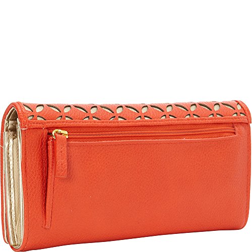 Feature : Custom Laser Cut Synthetic Leather with Metallic Underlay / Solid synthetic leather trim / Satin gold logo plaque / hardware / Full flap snap closure and outside zipper coin purse / I.D. window, multiple credit card slots and multiple slip pockets